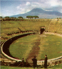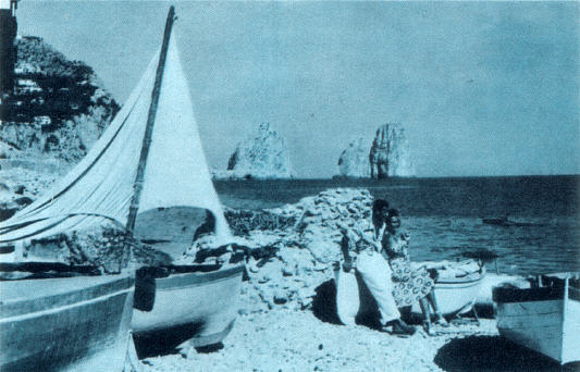 SOUTH of Rome lies Naples and its famous Bay, with the great volcano Vesuvius. Sorrento, with its wonderful climate and grandiose view of the bay , of Naples, is also departure point for a trip to the fabulous Isle of Capri. Here ! too, begins the beautiful scenic drive along the Amalphitan coast, stretching as far as Salerno. In spots the road is cut into the face of the cliffs, with columnar sections of rock seeming to give the effect of mile-long porticos bordering the endless blue reaches of the sea.