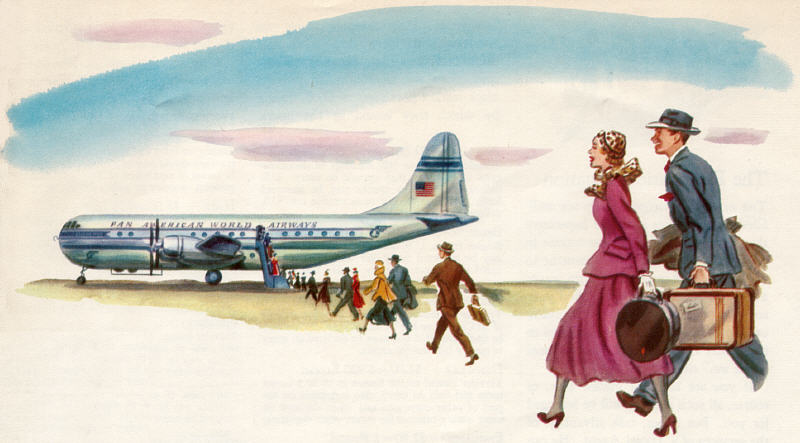 No need to plot and plan your vacation to fit the vagaries of steamer schedules. Pan American's giant Clippers leave for Europe every day. Even the "President", Pan American's super-deluxe, extra-fare flight, leaves direct for London several times each week. All you do is call your nearest Pan American Office for a reservation, or have a Travel Agent do it for you. Leave when you want to ... this week, next week — even tonight!
