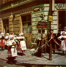 PRAGUE is one of the queenly cities of the world, with many examples of lovely architecture. One of the most famous is the Prague Castle, where the Czech Kings once lived, now the residence of the President. The old Town Hall, partly burned by the Germans, is also well-known, as is the Charles Bridge, and the view of the Castle from the Vltava embankment. Only a short way from Prague is the romantic medieval castle of Karlstejn. Take a steamer trip on the river Vltava, upstream to the great Vrane Dam, or downstream to the castle of Melnik and the miles of vine, yards. Hike through the dim aisles of the Carpathian Forests, in the high Tatra Mountains, descend into the underground wonderland of the endless Moravian Caves, some of them still unexplored. Southeast Moravia is famous for its folklore and bright peasant costumes. In Slovakia, the Danube, blue and beautiful, flows by interesting Bratislava. And on its banks near Komarno, a fort which defended Western Europe for centuries, are the remains of an ancient Roman camp.