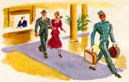 When the morning sun pokes his rays through your window and it's time to rise and shine, you'll find spacious dressing rooms available. Plenty of room for freshening up, big mirrors, stainless steel fixtures, and the stewardess can supply replacements if you've forgotten your toothbrush, paste or aftershave lotion. All in all, it's been a perfect trip, hasn't it? And now, keep a sharp lookout from your window, for in a matter of minutes your destination will be coming into view.