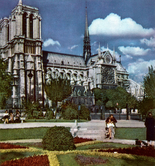 There's always a section of Paris to fit your feelings of the moment. Sit in a sidewalk cafe, on any one of the Grand Boulevards, and watch the kaleidoscope of Parisian life flow past. Wander through the quaint, twisting, narrow streets and across the graceful bridges that span the Seine. Watch sidewalk artists ply their trade. Visit the beautiful flowers and fountains of the Tuileries. Or spend thrilling hours among the fabulous art treasures of the world, famous Louvre.